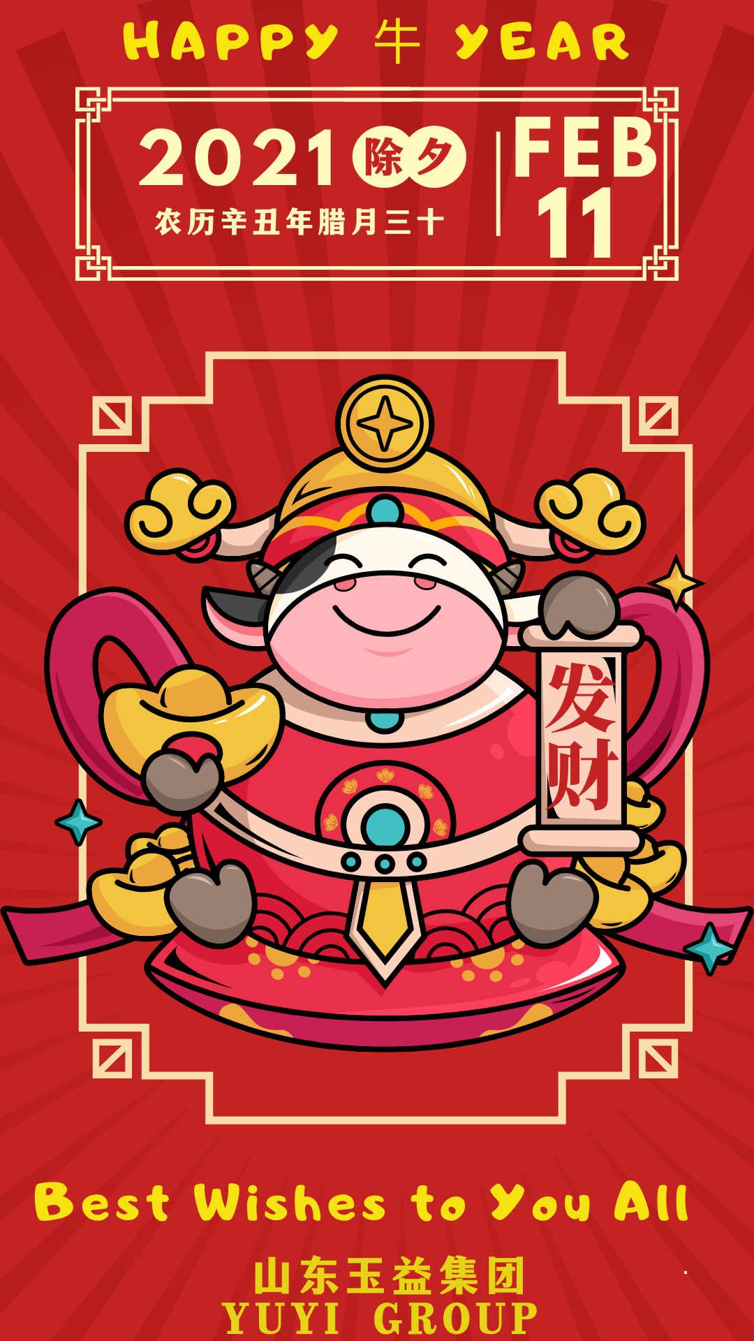 值此新春佳節(jié)將臨之際,玉益集團(tuán)祝愿大家及家人們牛年大吉,闔家歡樂,平安健康,萬(wàn)事如意!